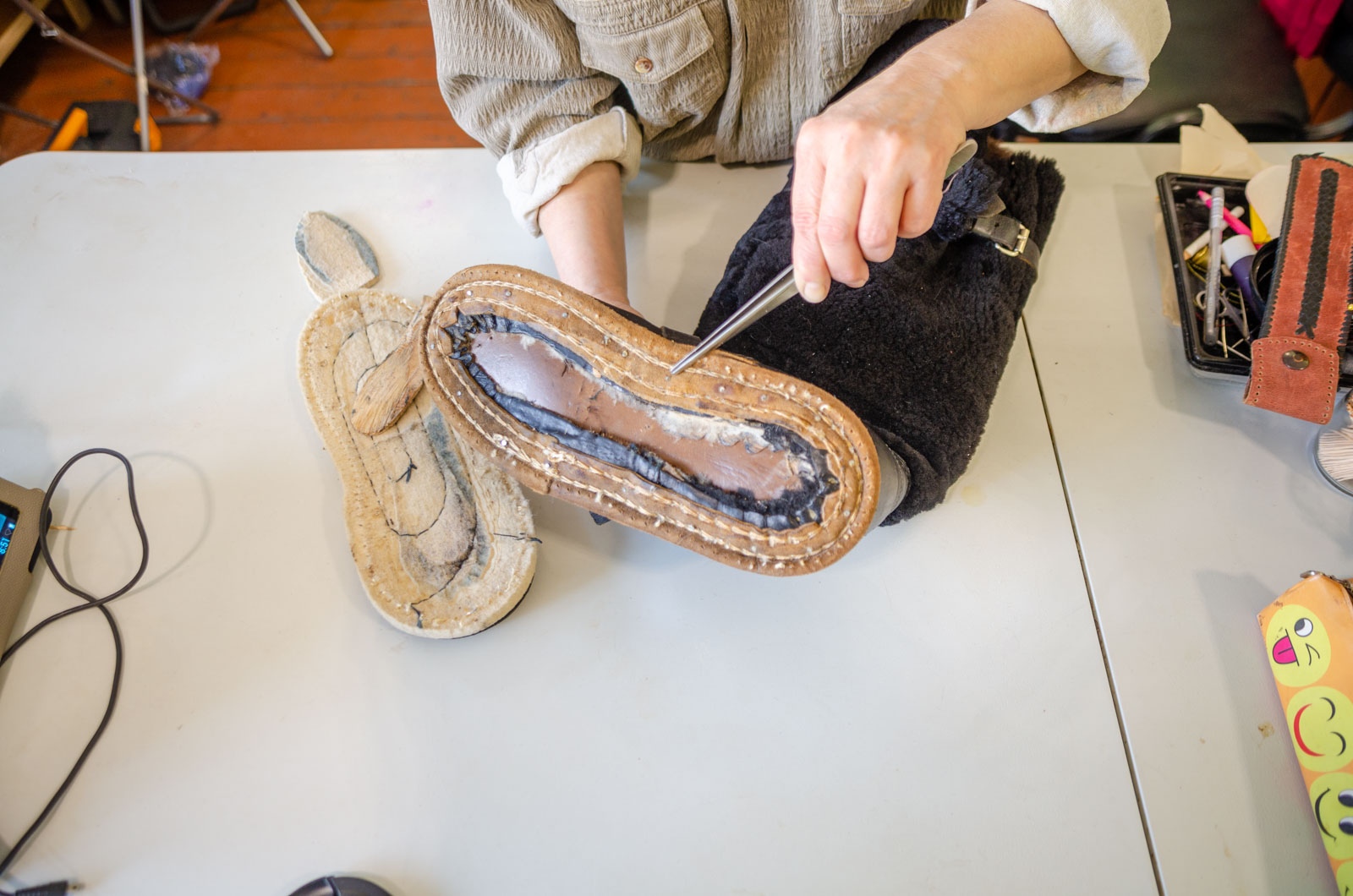 Изначально план был простым: перекрыть старую войлочную подошву современным накатом из микропоры. Однако, как только я засунула руку внутрь унта, меня ждал настоящий шок. По периметру всей затяжной стельки торчали гвозди. Целые ряды!