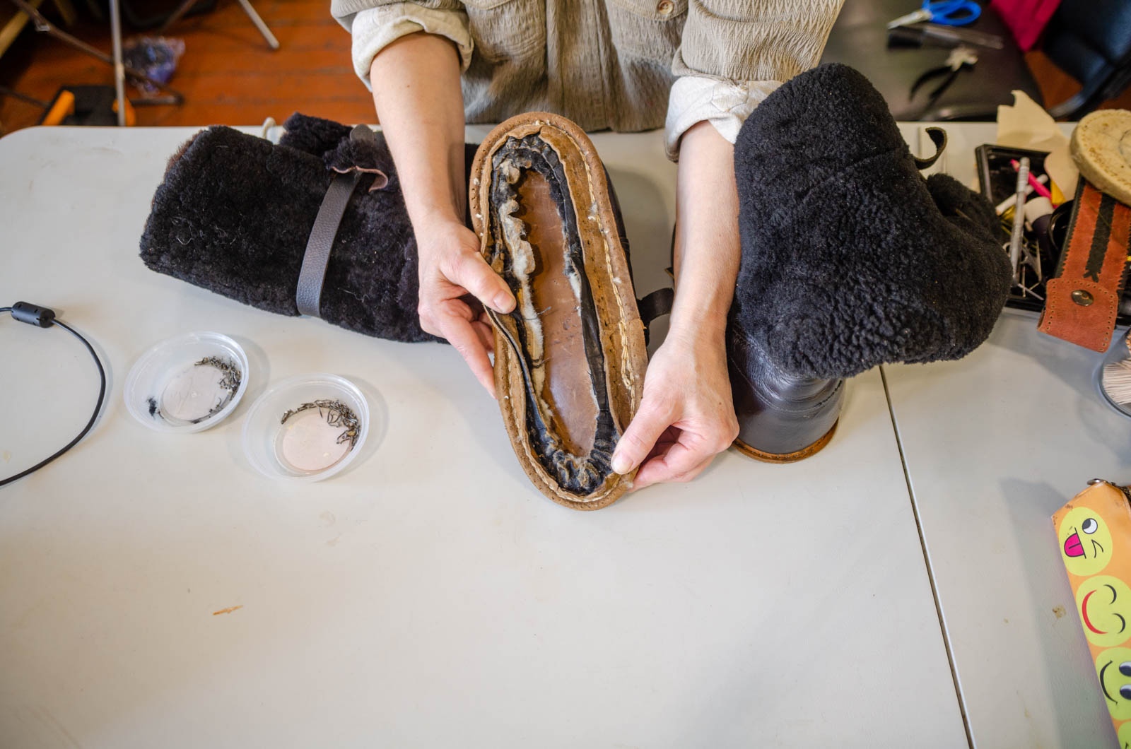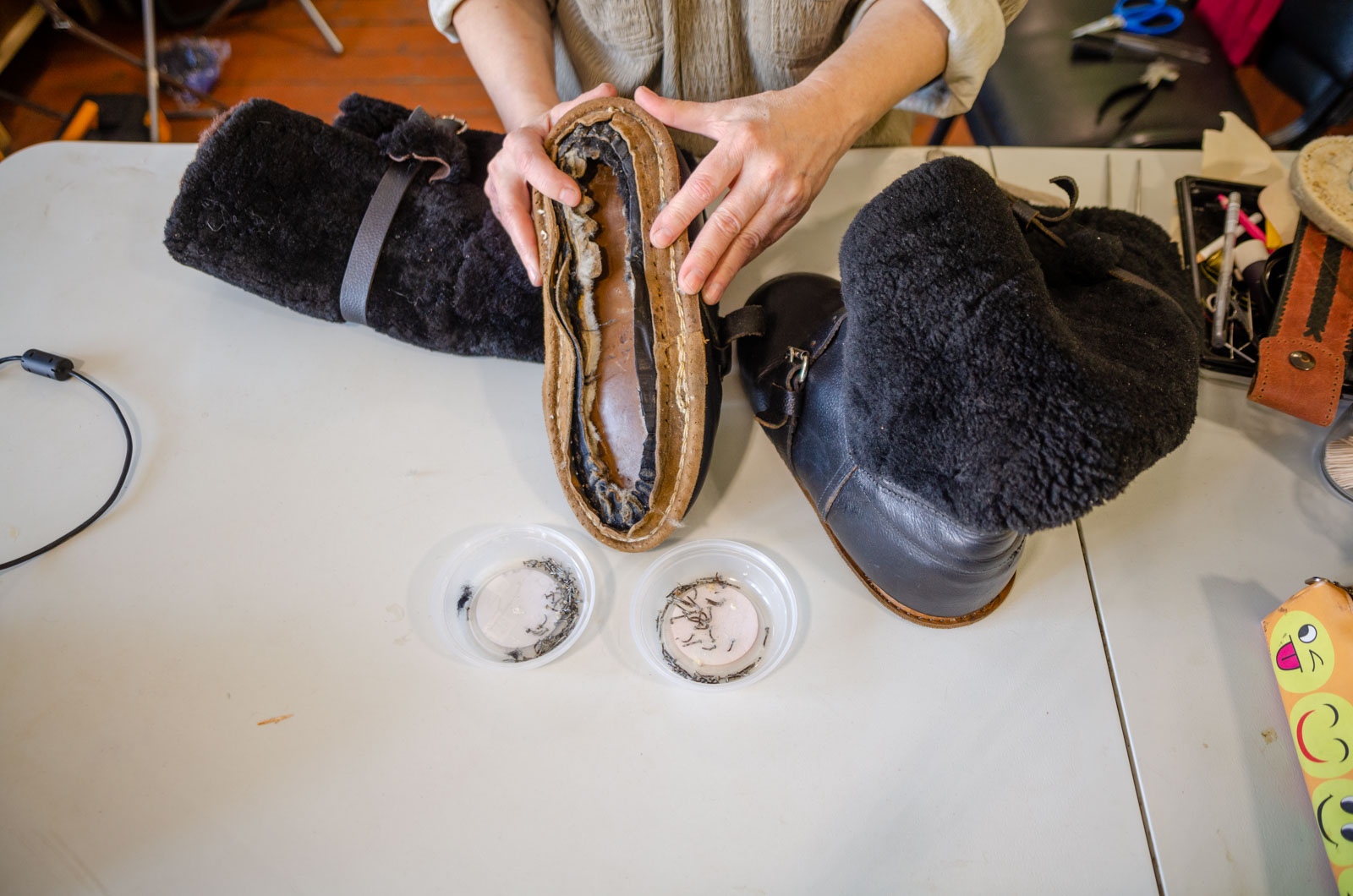 План работ пришлось срочно менять. Прежде чем ставить унты на фабричную подошву, нужно было разобраться с «ежом» внутри.