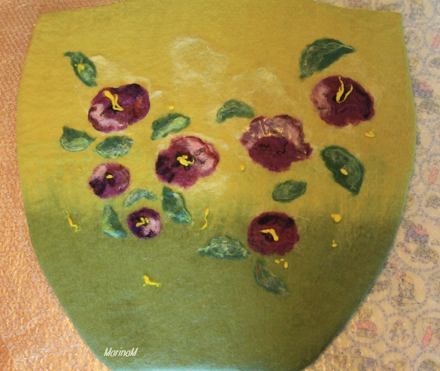 С декором особенно не мудрили: минимализм в начальном варианте, даёт массу возможностей для декорирования сумки после высыхания. Можно использовать набивку иглой, можно вышивку, можно объёмные валеные цветы — в общем есть, где разгуляться фантазии.